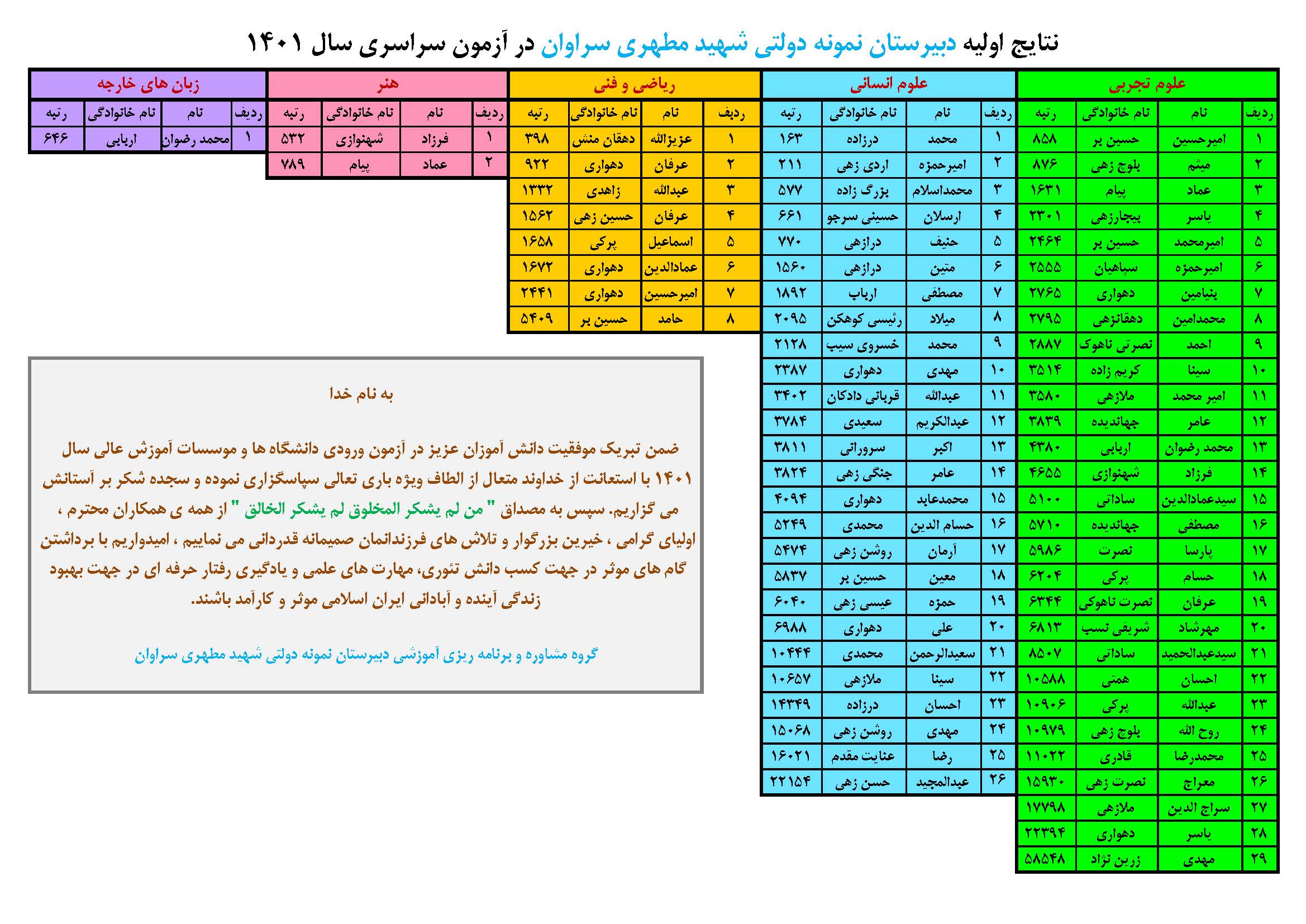 بازدید گروه جهادی السابقون از دبیرستان نمونه شهید مطهری سراوان تجلیل از دانش آموزان برتر آزمون کانون 16 آبان ماه تبریک به پذیرفته شدگان آزمون ورودی دبیرستان نمونه شهید مطهری سیزدهمین همایش تجلیل از پذیرفته شدگان آزمون سراسری سالهای ۱۴۰۲ و ۱۴۰۳ دبیرستان نمونه شهید مطهری سراوان اعلام نتایج پذیرفته شدگان آزمون ورودی دبیرستان نمونه دولتی شهید مطهری در سال تحصیلی 1404-1403 اعلام نتایج پذیرفته شدگان آزمون ورودی دبیرستان نمونه دولتی شهید مطهری در سال تحصیلی 1404-1403 برگزاری جشن پیشرفت تحصیلی سال تحصیلی ۱۴۰۳-۱۴۰۲ برگزاری اردوی برون مدرسه ای به مقصد جاده سلامت برگزاری اردوی برون مدرسه ای بمقصد جاده سلامت بازدید معاون محترم آموزش متوسطه اداره کل و هیئت همراه بازدید مدیر و معاونین آموزشگاه از دبیرستان پسرانه دانشگاه بازدید دانش آموزان از کتابخانه عمومی شهید مطهری سراوان بمناسبت هفته کتاب و کتابخوانی بازدید دانش آموزان دبیرستان متوسطه اول شهید مطهری ناهوک از آموزشگاه